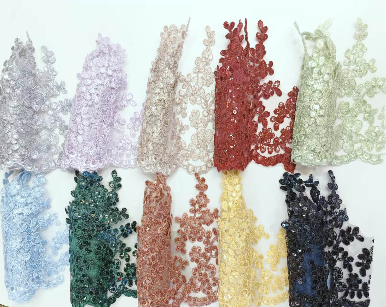 Luxury Bridal en dentelle française Robe de mariée à paillettes Bordeau de liaison pour la dentelle de mariage avec une base de dentelle française haut de gamme, des paillettes brillantes cousues à la main, les motifs sont exquis et tridimensionnels, avec une texture légère et lisse. Des décorations haut de gamme spécialement conçues pour les robes de mariée et les robes de soirée, disponibles en blanc ivoire, en or champagne et autres tons, soutenez la largeur et les motifs personnalisés, mettant en évidence un style luxueux et romantique