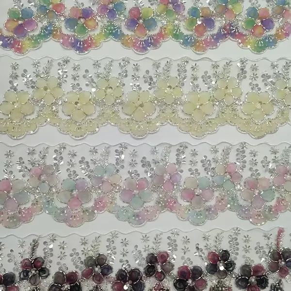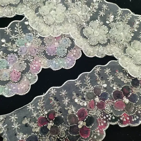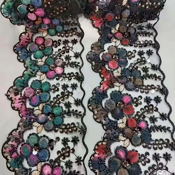 | Marchandise | Dentelle brodée multicolore avec ruban de fleurs en maille 3D, Tube perlé, dentelle brodée de codes à barres | ||
