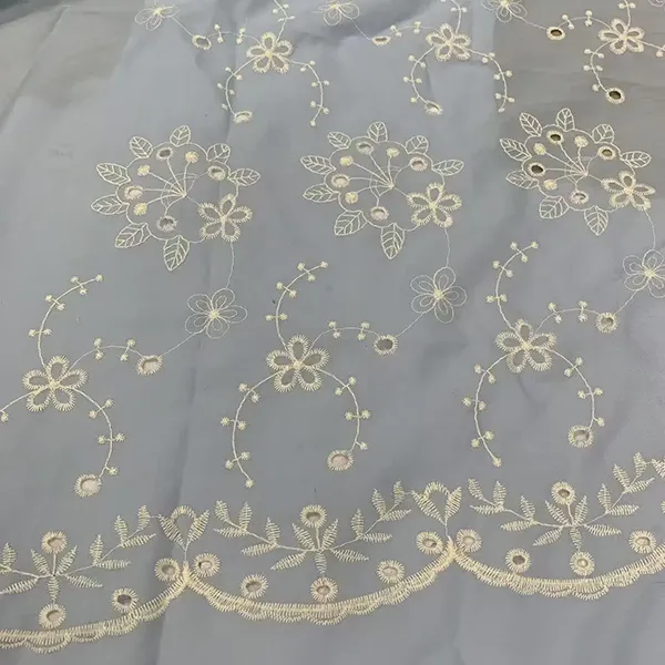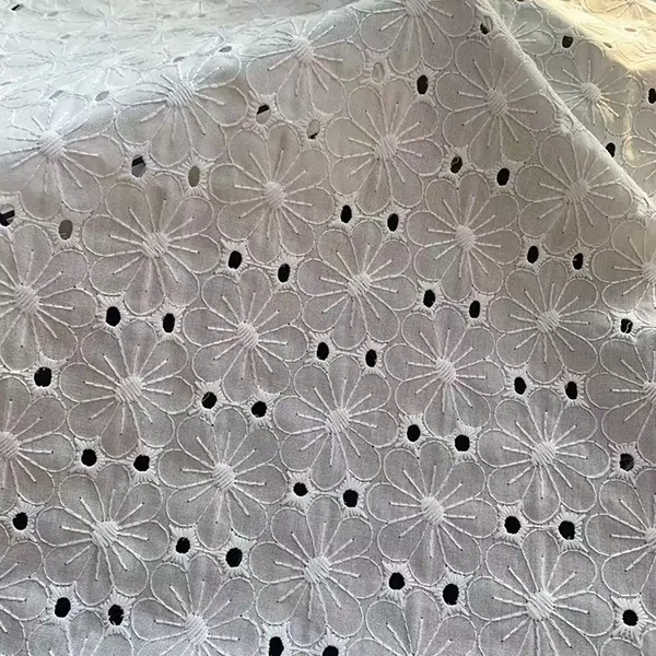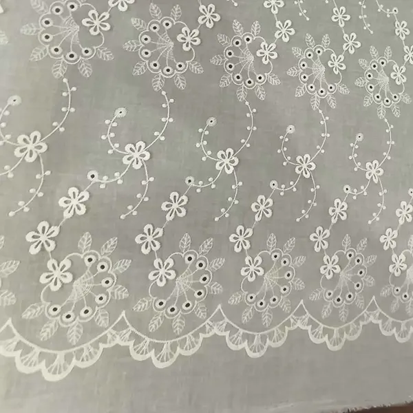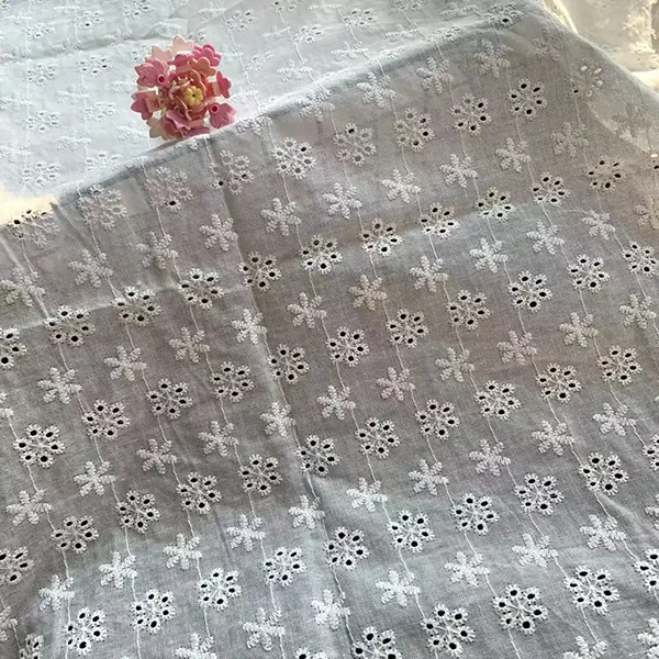 Coton de coton blanc tissu d'œlats pour robe Ce tissu en dentelle élégant dispose de broderies délicates et de coupes d'oeillets, créant un matériau respirant et léger parfait pour les robes, les chemisiers et les usures de mariage. Les motifs floraux complexes et les bords festonnés ajoutent un charme romantique et vintage, tandis que le coton naturel assure la douceur et le confort.
